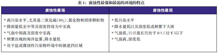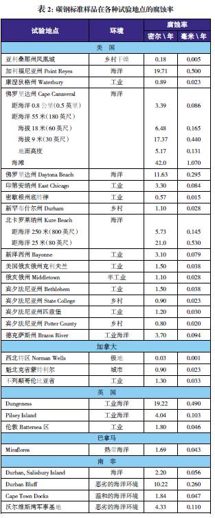 世界各地都進(jìn)行過(guò)各種應(yīng)用環(huán)境下的金屬腐蝕性能比較試驗(yàn)。以碳鋼為標(biāo)準(zhǔn)樣品對(duì)這些試驗(yàn)地點(diǎn)的腐蝕性進(jìn)行了比較。表2給出了標(biāo)準(zhǔn)樣品在北美試驗(yàn)地點(diǎn)的腐蝕率數(shù)據(jù)。盡管某些地點(diǎn)處于經(jīng)常使用除冰鹽的地區(qū),但樣品并未暴露于除冰鹽之下。